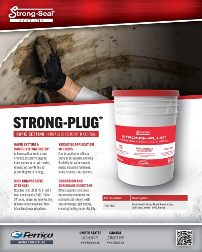 Strong-Plug® 55 lb. rapid-setting, high-performance leak sealing solution designed for use in concrete and masonry structures. It is ideal for critical infrastructure repairs, especially in manholes, tanks, tunnels, and pipelines. With a final set time of less than 1 minute, Strong-Plug® immediately halts water infiltration, allowing for fast and effective repairs. Its impressive compressive strength—over 1,000 PSI in just 1 hour and 2,500 PSI in 24 hours—ensures long-lasting, durable results that stand up to the demands of heavy traffic and harsh environments.