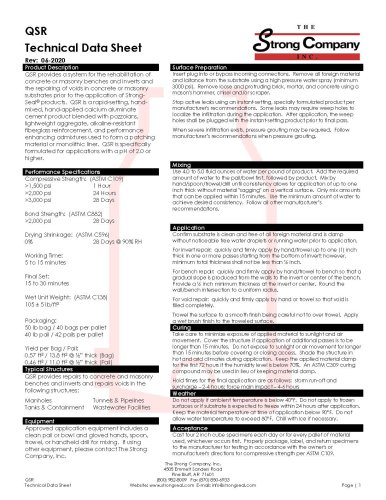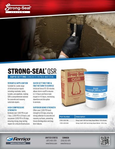 Strong-Seal® QSR 40 lb. rapid-setting, high-performance patching material designed for repairing and restoring concrete and masonry structures, with a special focus on manhole rehabilitation. Offering impressive compressive strength—over 1,500 PSI in 1 hour and 3,000 PSI in 28 days—QSR ensures long-lasting durability even in harsh, corrosive environments. Its quick set time of 15-30 minutes allows for fast application, minimizing downtime and enabling storm runoff to resume in just 2-4 hours.