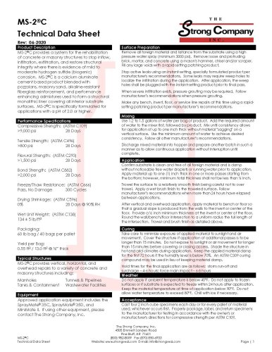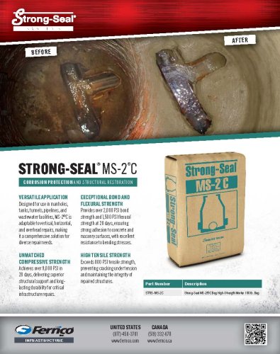Strong-Seal® MS-2®C 60 lb. high-performance, fiber-reinforced cementitious mortar specifically designed for the rehabilitation of concrete and masonry structures in challenging environments. Achieving over 9,000 PSI compressive strength in 28 days, it provides unmatched durability and structural support. With its exceptional bond, flexural, and tensile strengths, MS-2®C adheres securely to existing substrates and prevents future disintegration. Engineered for use in manholes, tanks, tunnels, and wastewater facilities, MS-2®C excels in both vertical and overhead applications. Its advanced formulation, including alkaline-resistant fiberglass, ensures longterm stability and resistance to chemicals, freeze/thaw cycles, and biogenic corrosion in environments with a pH of 2.0 or higher.