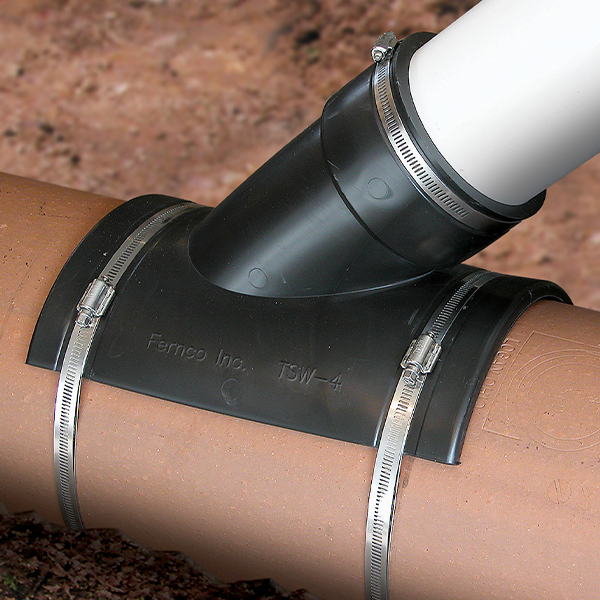 Flexible Tap Saddles provide a soil-tight seal. Use Fernco Tap Saddle Pressure Kit (TSPK-46) for a water-tight connection up to 10 PSI.
